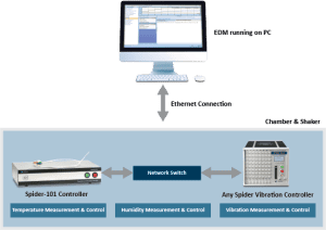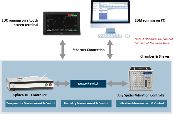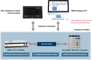 The Spider-101 can also operate in an independent climatic chamber for temperature and/or humidity without participating in vibration testing. The EDC software developed by the Crystal Instruments is a touch screen application software that runs on any Windows 10 platform.