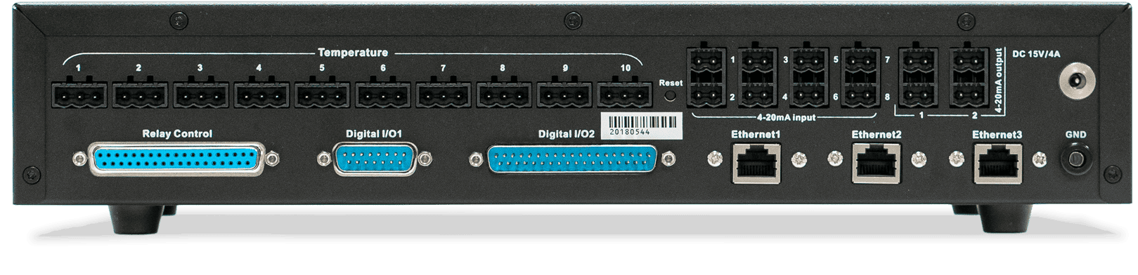The Spider-101 provides ten input channels using either RTD or K-type thermocouple for temperature measurement, eight 4-20mA input channels for humidity sensors. There are 32 configurable relay control outputs to control compressors and other mechanical systems, as well as digital I/O channels for alarm/status monitoring.