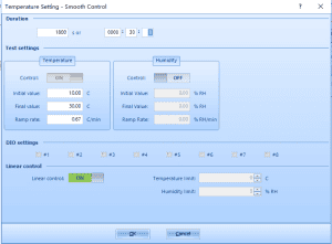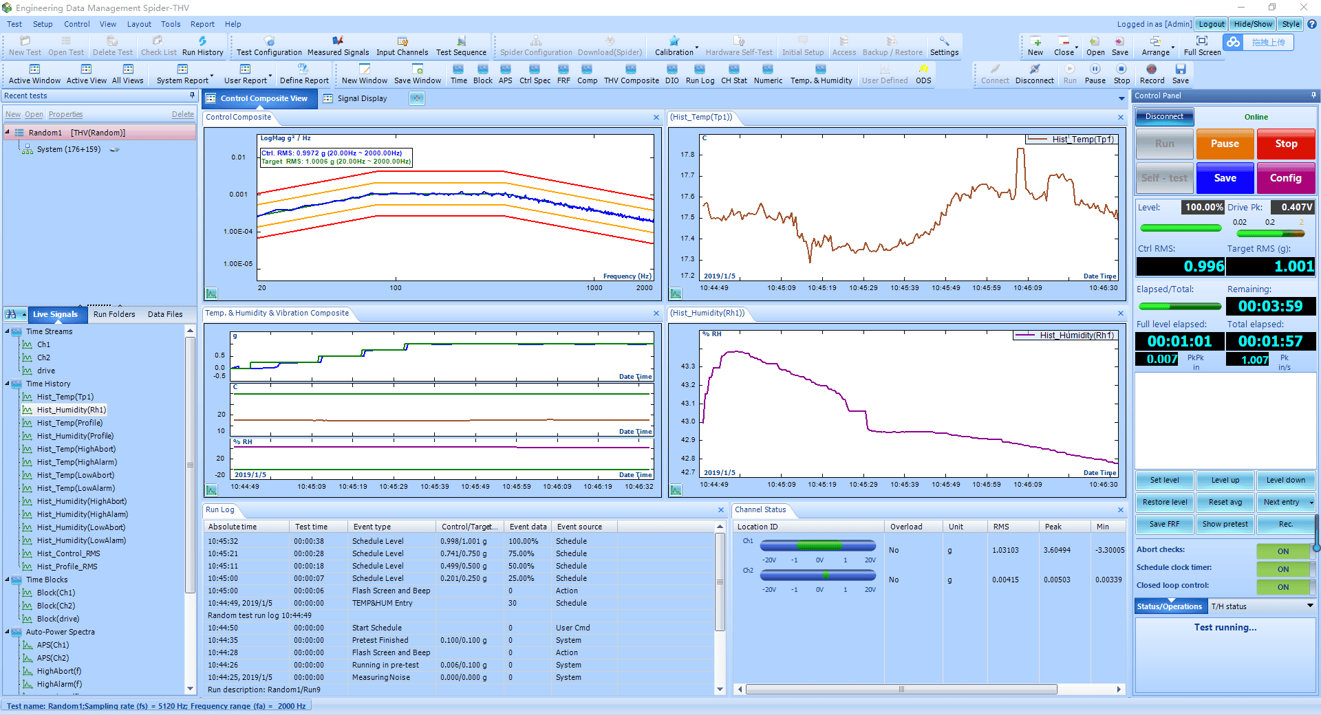 EDM (a PC-based software developed by Crystal Instruments) is used when vibration control is required to be combined with temperature and humidity control. Parameter and schedule setup between all combined physical quantities are fully integrated in one user interface. Vibration tests such as Random, Sine, Shock, SoR, RoR, and other types can be executed together with various cycle settings of temperature and humidity.