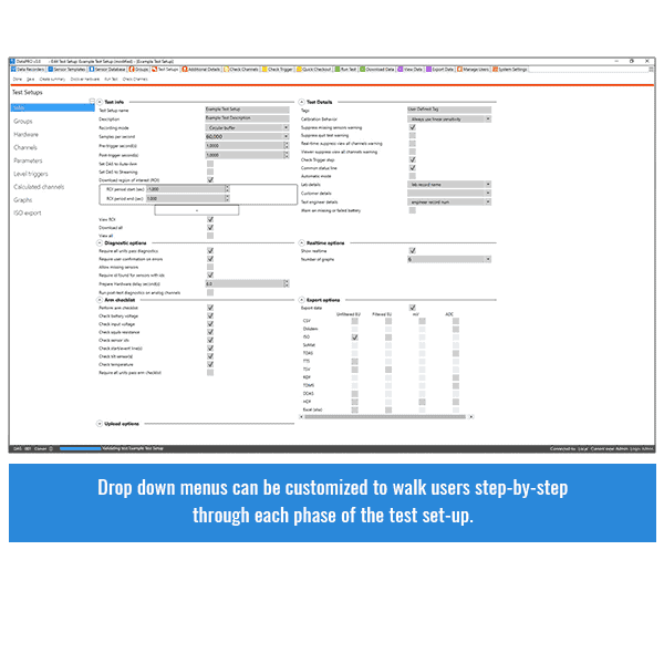DataPRO is a powerful set-up, control and data viewing software for DTS hardware. The intuitive user interface is designed to help test engineers create, control and manage every aspect of a test. DataPRO makes it easy to access complete sensor and hardware details, plus share test information via standalone or centralized SQL databases. Key features include integrated off-line test builder, extensive ISO MME database, enhanced diagnostic tools, multiple viewing options and automatic report generation.