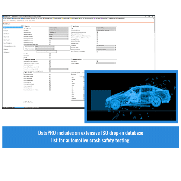 • Extensive ISO drop-in database list for crash safety testing, easily integrates codes for test set-up and data export • Supports squib fire for airbag and seat belt testing • Multi-level permissions and access per user or test Options