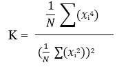 Kurtosis can be expressed as a normalized value “K” by dividing the fourth statistical moment divided by the square of the second statistical moment. The equation below shows the K calculation for N samples.
