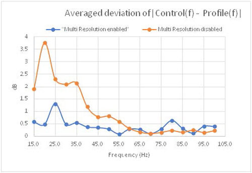 With multi-resolution control enabled, the resolution in the low-frequency range is much higher and the control performance is greatly improved. The control spectrum matches the profile below 100Hz as well as 200 to 500Hz.