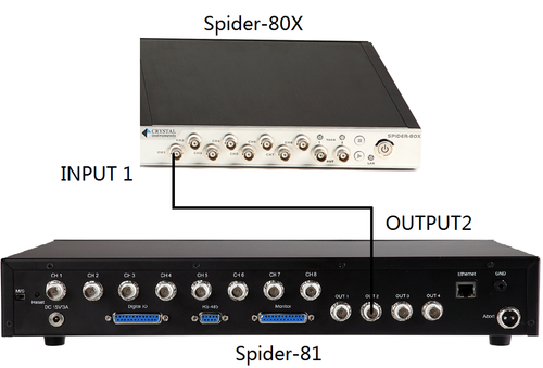 As illustrated in the below picture, a typical Sine Reduction test system consists of a Vibration Controller and a Dynamic Signal Analyzer. The Spider-81 VCS provides eight channels of input to run the Sine Control. By connecting its Output 2 (with the COLA signal) to the Channel 1 input of a Spider-80X DSA module running Sine Reduction, the combined system provides 15 input channels total running with same tracking filters in perfect synchronization. With more modules to the Spider-80X, the input channel count will be increased per user requirement.