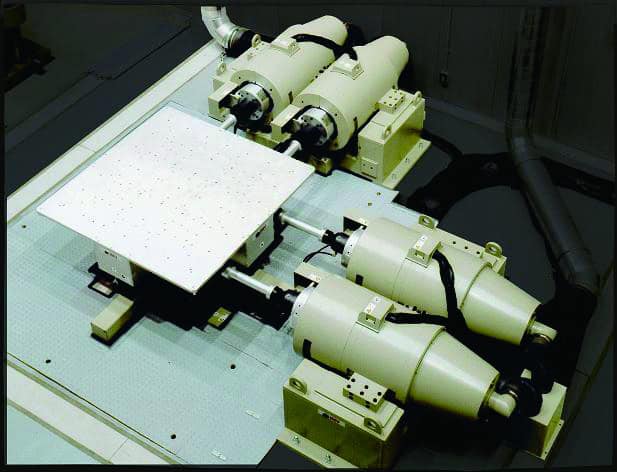A total of 10 vibration generators (6 vertical and 4 horizontal) and a 4000mm by 3500mm large size table allow the simultaneous 6 DOF vibration testing. This versatile platform is ideal for testing large items such as railway carriage components.