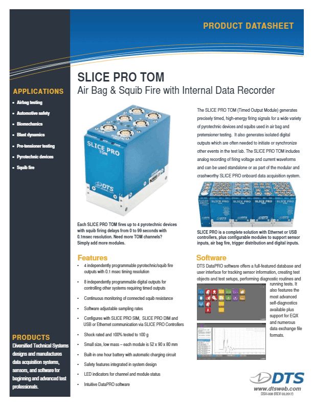 High Performance• Microprocessor, excitation, signal conditioning, adjustable filters • Standalone operation, no tethered PC required • Rugged packaging designed for extreme test environments Mega-Sample• User-selectable sampling rates up to 1M sps/channel • Data bandwidth options up to 200 kHz • Record for milliseconds to hours; data direct-writes to 16GB flash memory User-Configurable• Modules to support sensor inputs, airbag fire, triggering and digital inputs • Daisy-chain systems for large channel counts • Sensor support including: bridge, accelerometers, IEPE, strain gages, load cells, MEMS, voltage, temperature Powerful Software• Complete set-up, control and data viewing software • Advanced test set-up features and diagnostics tools • Multiple sensor import and data export options Options