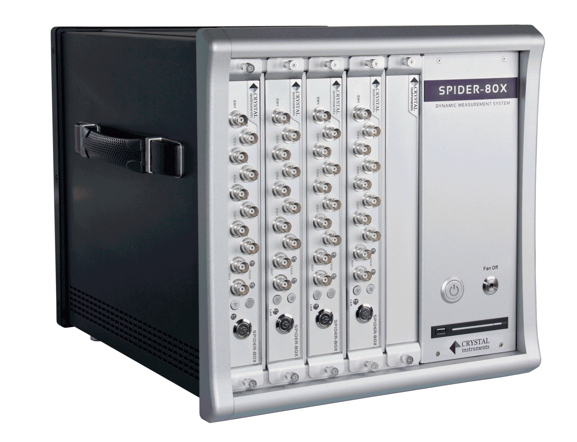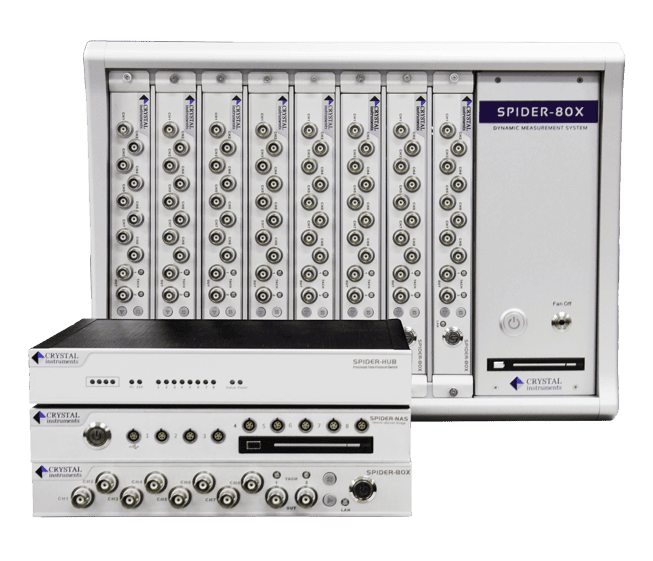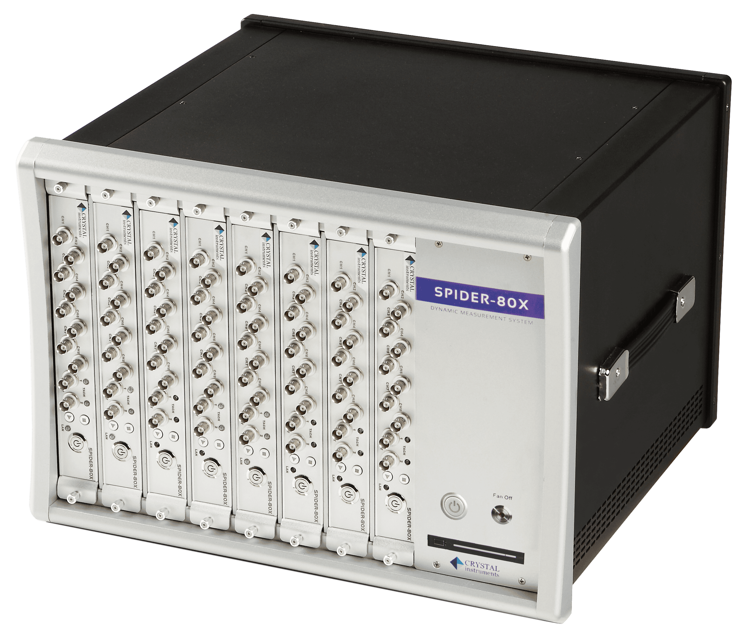 The Spider’s performance is the best in class with the highest dynamic range of any similar product. With patented technology, the Spider-80X achieves 160 dBFS input dynamic range (defined in the time domain). Each measurement channel detects signals as small as 6 μV and as large as ±20 V. Such high dynamic range eliminates the need for input range and or gain settings of traditional data acquisition systems.