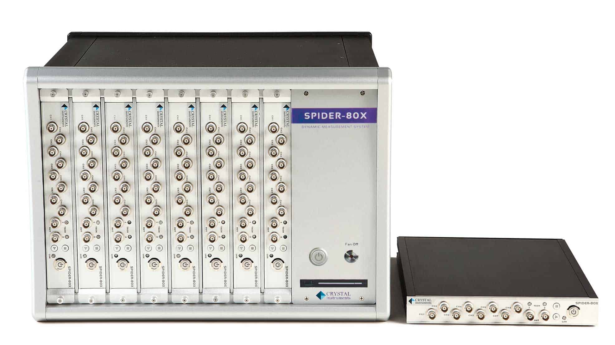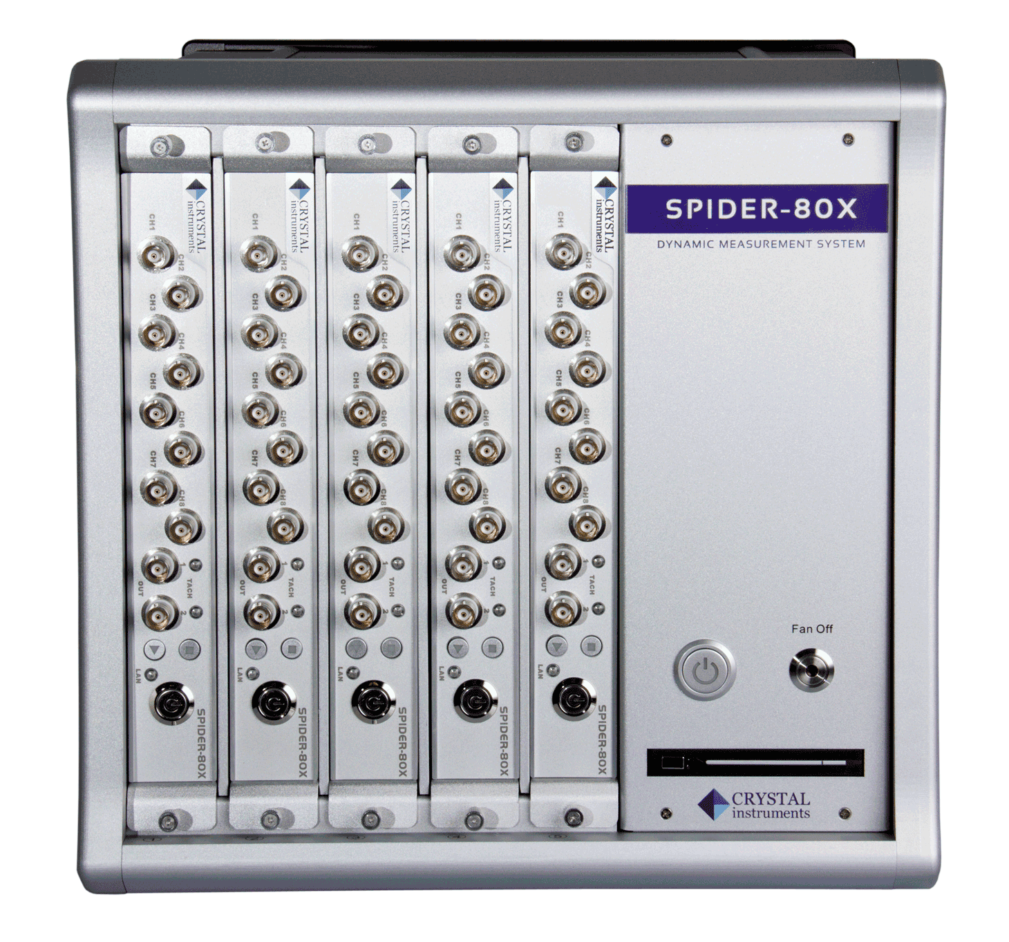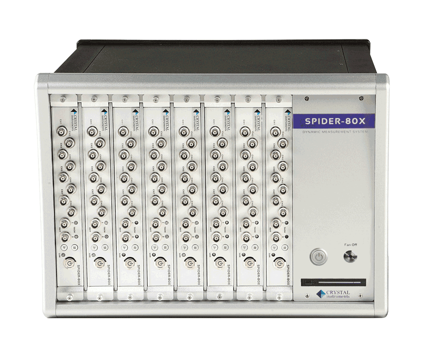 The Spider-80X is a compact package designed for applications in three fields: dynamic data acquisition, vibration control, and machine monitoring. It features eight analog input channels and two channels that can be software selected as analog outputs for vibration control or tachometer inputs for the analysis of rotating machinery.