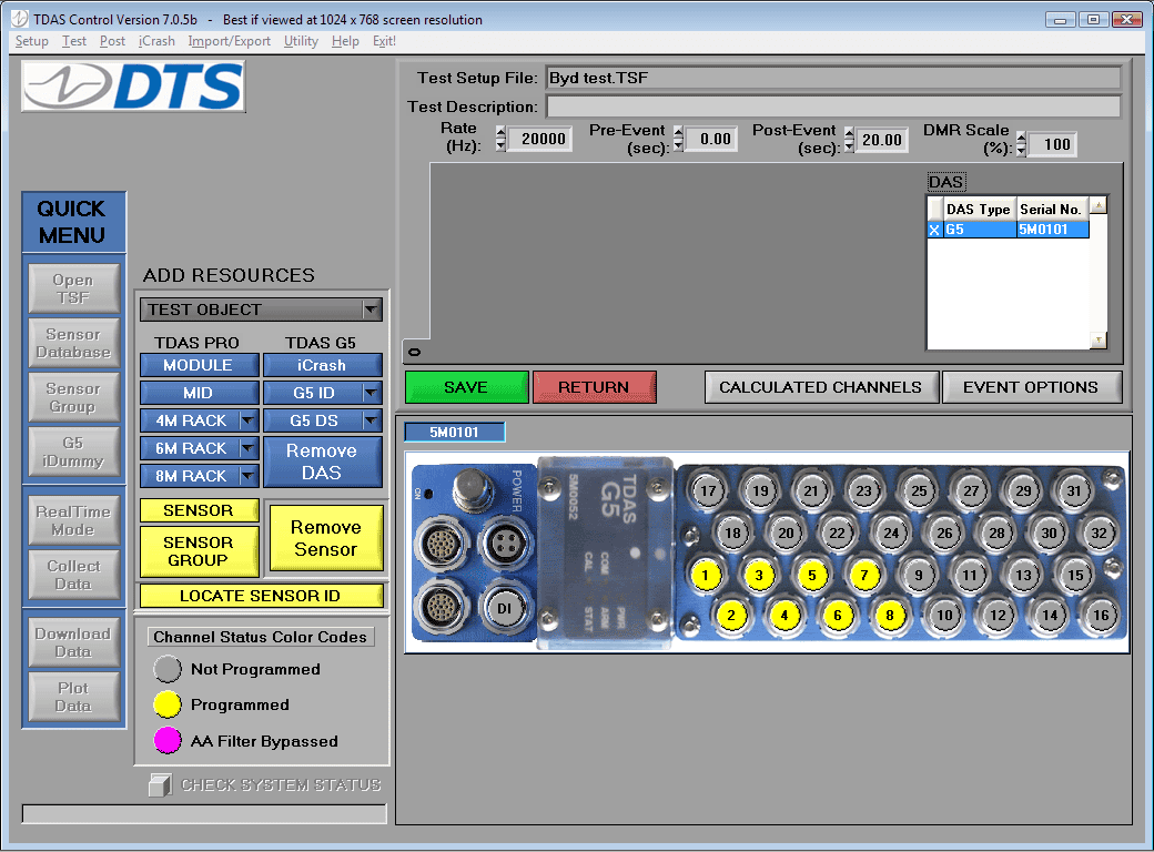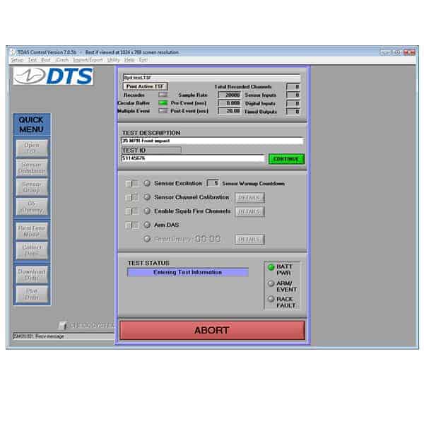 TDAS Control is the original set-up, control, viewing and export software developed by DTS. TDAS Control provides easy-to-use tools for configuring output timing, as well as advanced features such as automatic sensor assignment, detailed channel diagnostics, real-time display and squib fire for airbag testing. TDAS Control only works with TDAS G5 and TDAS PRO.