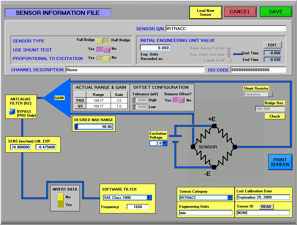 There are no potentiometers to adjust because hardware settings are made completely under software control. Every time a data collection task is initiated, the software runs a thorough calibration check on each measurement channel. Appropriate gains are set, sensor offsets are zeroed and anti-aliasing filters are set. The software also contains standard point-and-click processing options for SAE-class post-filters, integrals, resultants, HICs, and others.