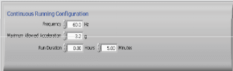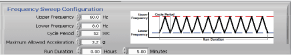 Select either continuous vibration or a frequency sweep mode. In continuous vibration mode, select the frequency level, maximum acceleration limit, and run duration. In frequency sweep mode, select the lower and upper frequency limits, cycle period, maximum acceleration limit and run duration.