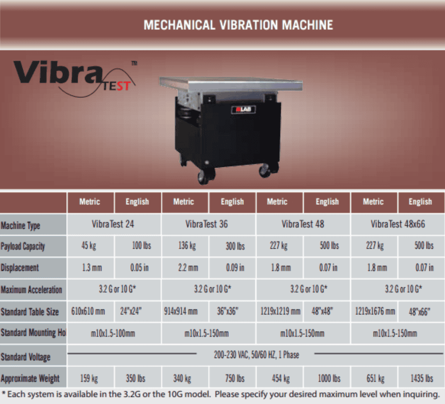In either mode, the user calculates the displacement with a known frequency and acceleration and then manually adjusts counter-weights on the vibration table to deliver the calculated displacement.